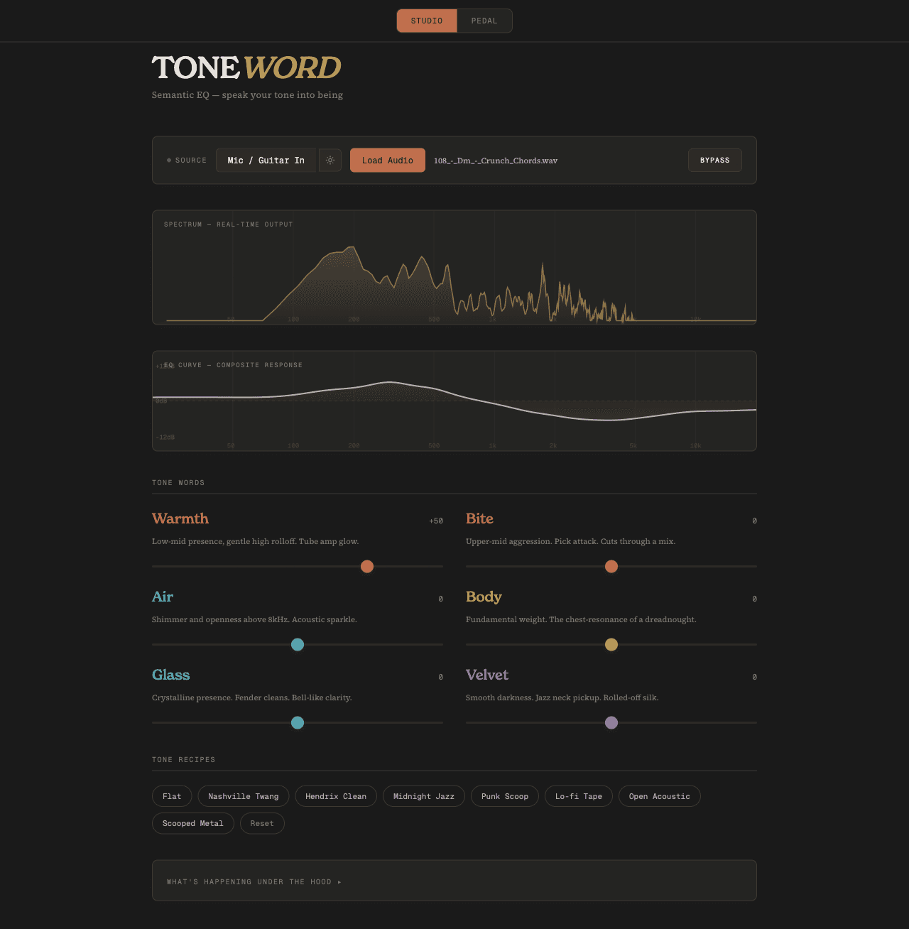 Say "warmth." Hear warmth. A semantic EQ that replaces frequency knobs with tone words—because guitarists think in feelings, not filter curves. Web app, JUCE plugin, and a stompbox on the way.